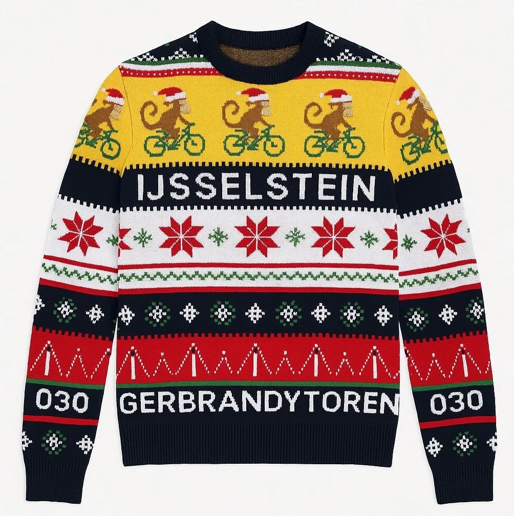 De feestelijke kersttrui is ontworpen door Bionda van Seventytoo, speciaal voor Impact IJsselstein. In het design zijn diverse herkenbare IJsselsteinse elementen verwerkt: