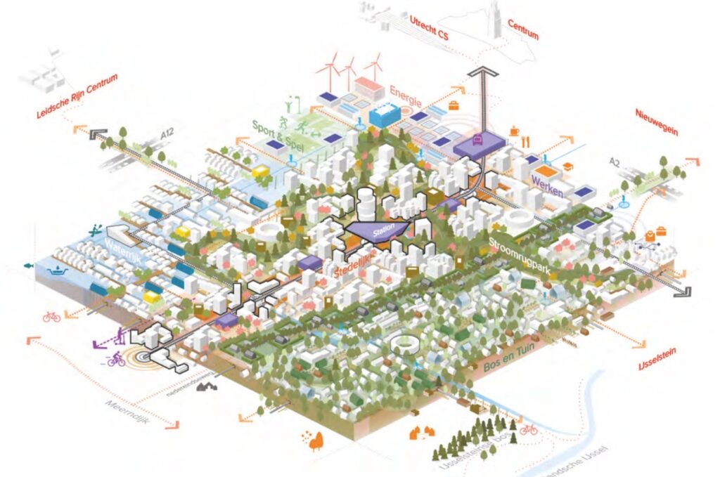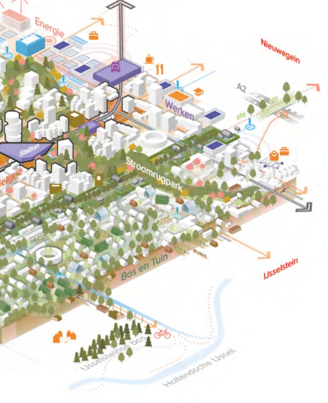 De gemeente zet ook in op goede fietsverbindingen en hoogwaardig openbaar vervoer. Automobilisten parkeren in gezamenlijke parkeergarages, zogeheten hubs, verspreid door het gebied. Gezondheid, lichamelijk, mentaal én sociaal, is een expliciet uitgangspunt in de plannen.